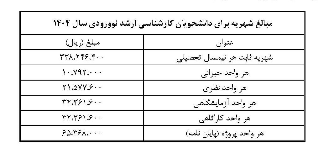 • جدول شهریه هر نیمسال براساس اعلام مراجع ذیصلاح پردیس مشخص می­شود و مبنای محاسبه شهریه خواهد بود.