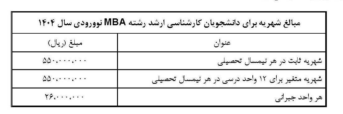 • شهریه علی الحساب نیمسال اول برای ثبت نام دانشجویان کارشناسی ارشد (رشته مدیریت MBA) مبلغ --/660/000/000ريال (شصت و شش میلیون تومان) است.