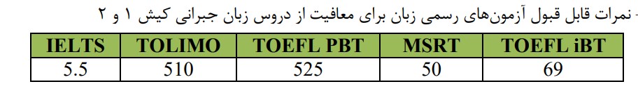 تذکر3: دانشجویان پردیس کیش دانشگاه صنعتی شریف ملزم به ارائه مدرک تسلط به زبان انگلیسی یا گذراندن دروس جبرانی زبان انگلیسی مخصوص پردیس هستند. حسب آیین نامه مرکز زبان پردیس (اینجا را کلیلک کنید) چنانچه دارای مدرک معتبر زبان باشید (مطابق با جدول زیر) از گذراندن دروس جبرانی زبان کیش1 و 2 معاف خواهید بود.