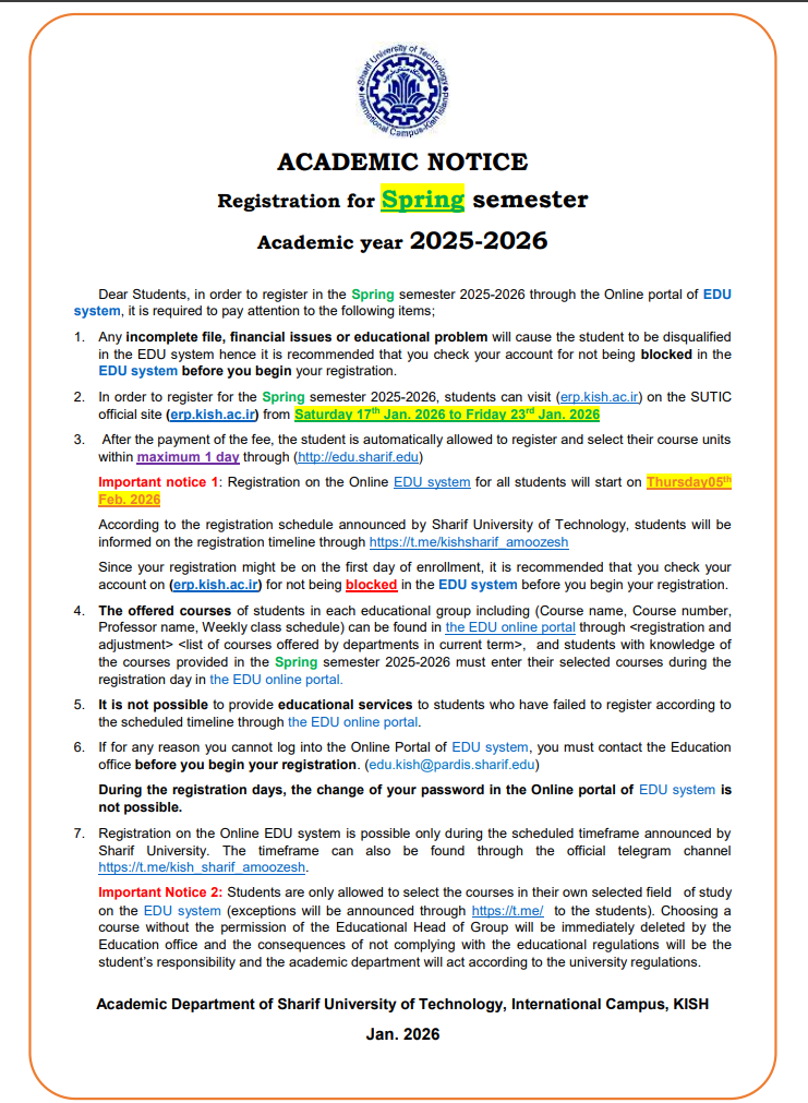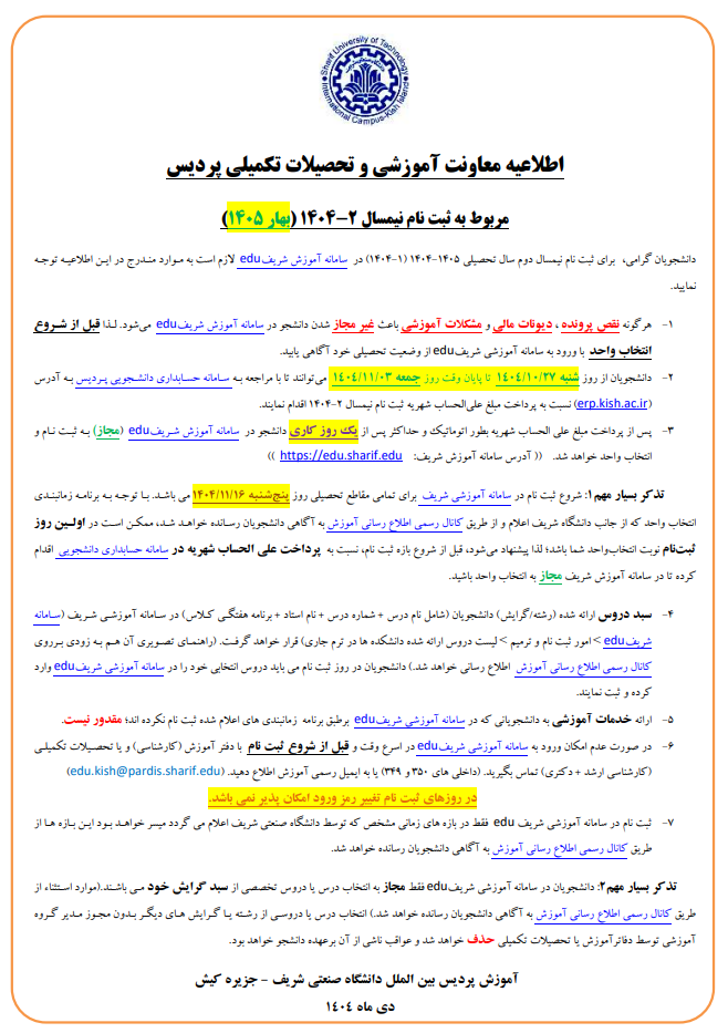 اطلاعيه اول آموزش پرديس پيرامون انتخاب واحد نيمسال 2-1404 (نيمسال دوم سال تحصيلی 1405-1404)