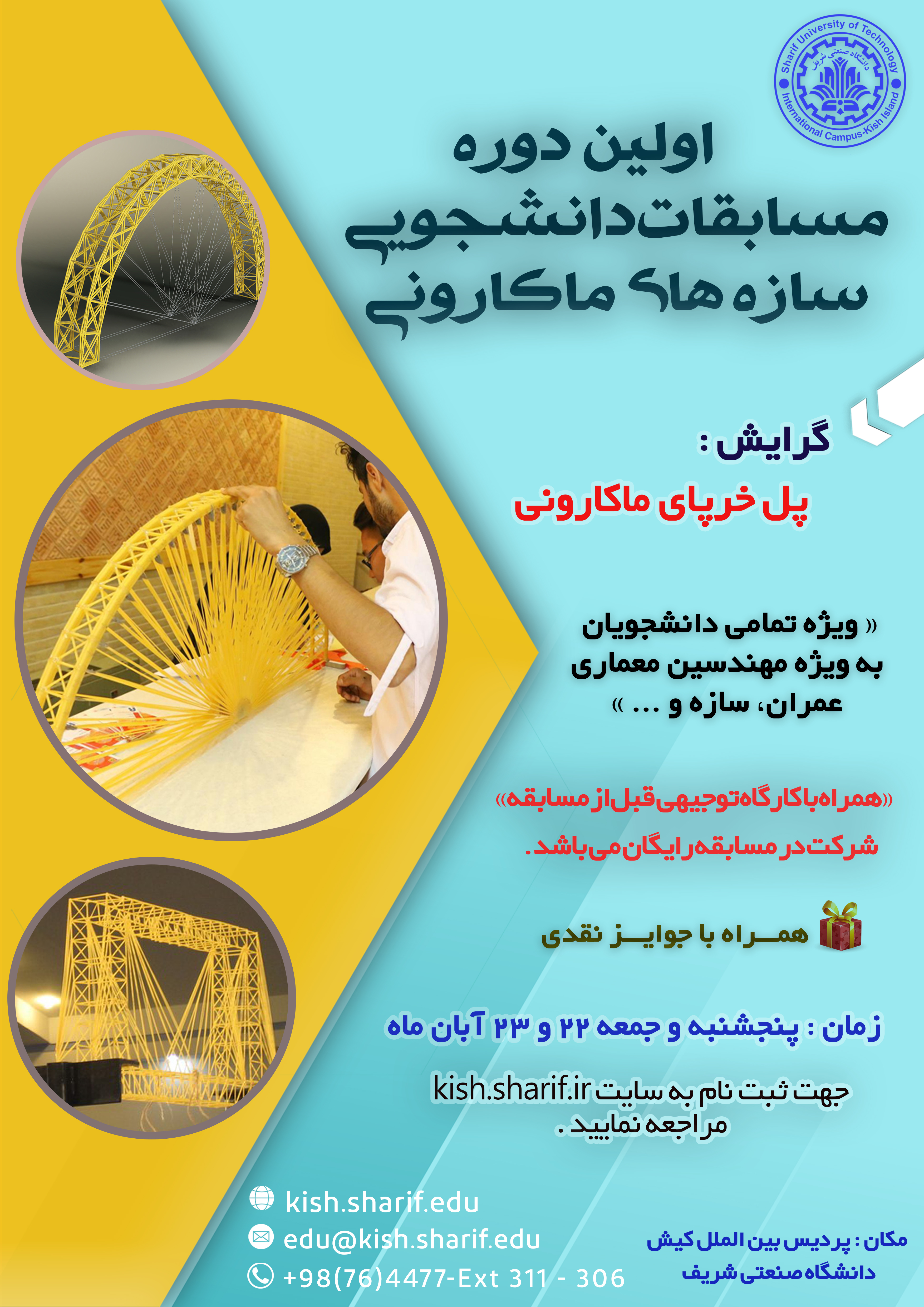 به بزرگترین رویداد دانشجویی جزیره کیش در زمینه طراحی و ساخت سازه‌های ماکارونی در پردیس بین الملل دانشگاه صنعتی شریف بپیوندید.
