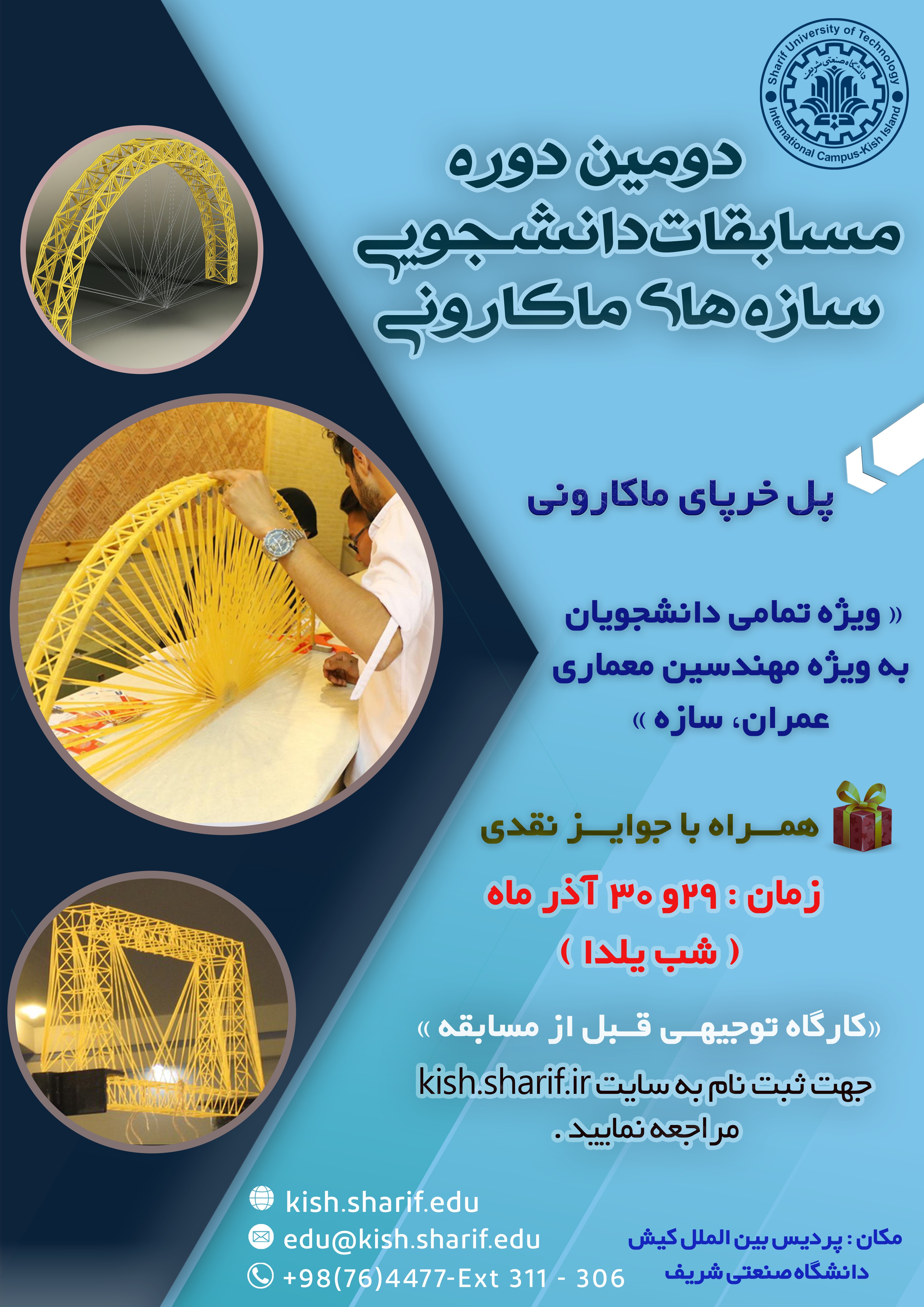 به بزرگترین رویداد دانشجویی جزیره کیش در زمینه طراحی و ساخت سازههای ماکارونی در پردیس بین الملل دانشگاه صنعتی شریف بپیوندید.