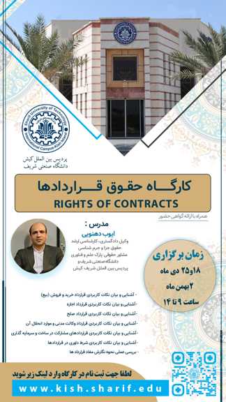 - آشنایی و بیان نکات کاربردی قرارداد خرید و فروش (بیع) -آشنایی و بیان نکات کاربردی قرارداد اجاره -آشنایی و بیان نکات کاربردی قرارداد صلح -آشنایی و بیان نکات کاربردی قرارداد وکالت مدنی و موارد انحلال آن -آشنایی و بیان نکات کاربردی قراردادهای مشارکت در ساخت و سرمایه گذاری -آشنایی و بیان نکات کاربردی شرط داوری در قراردادها- بررسی عملی نحوه نگارش مفاد قرارداد ها